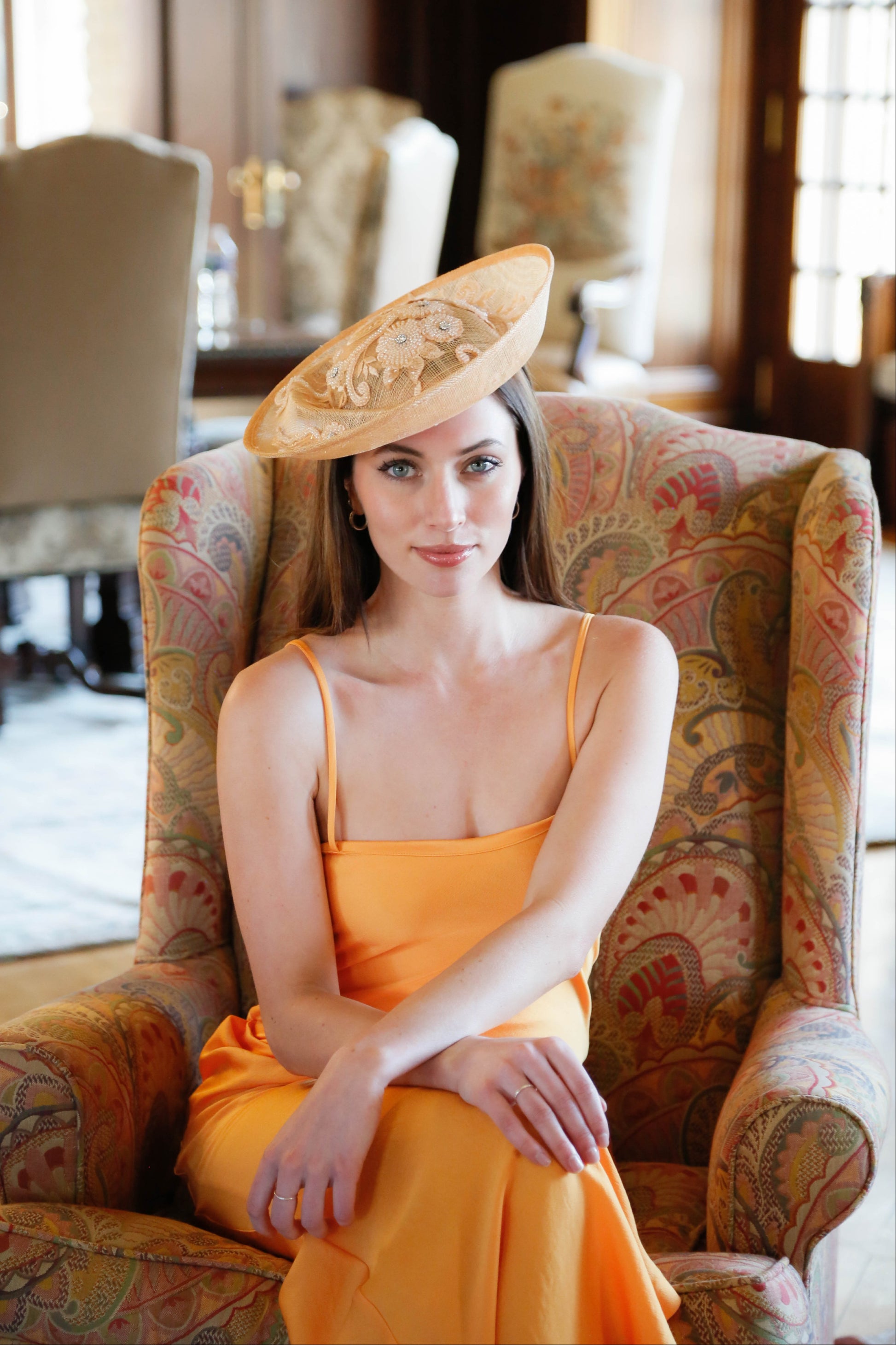 The Jenna is a beautiful peach saucer featuring delicate and detailed lace. Secured using hat elastic