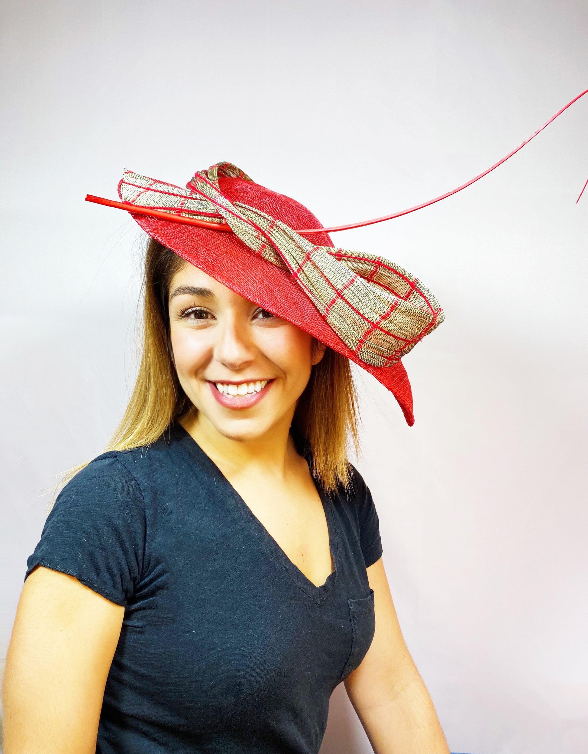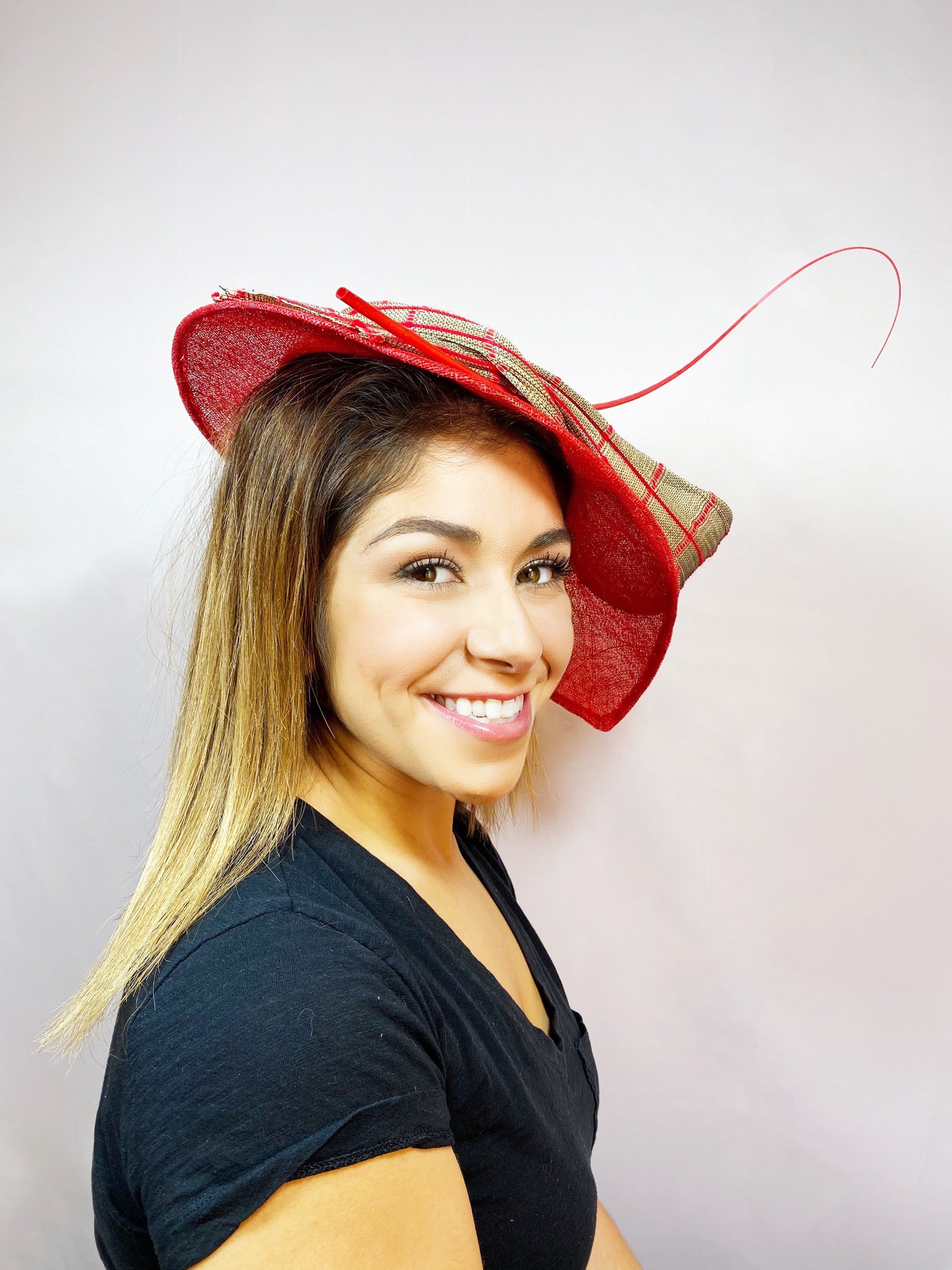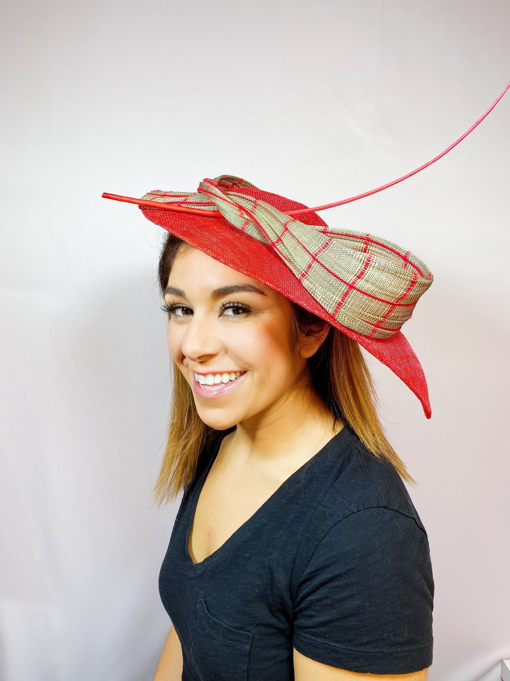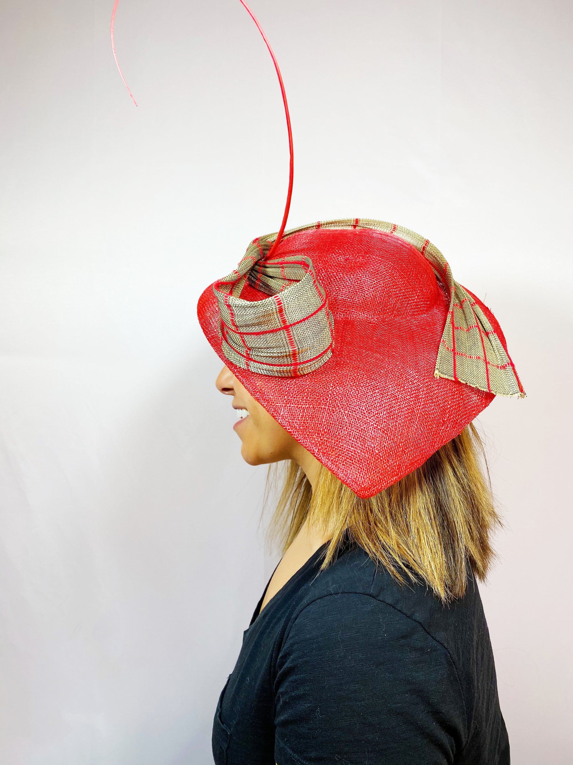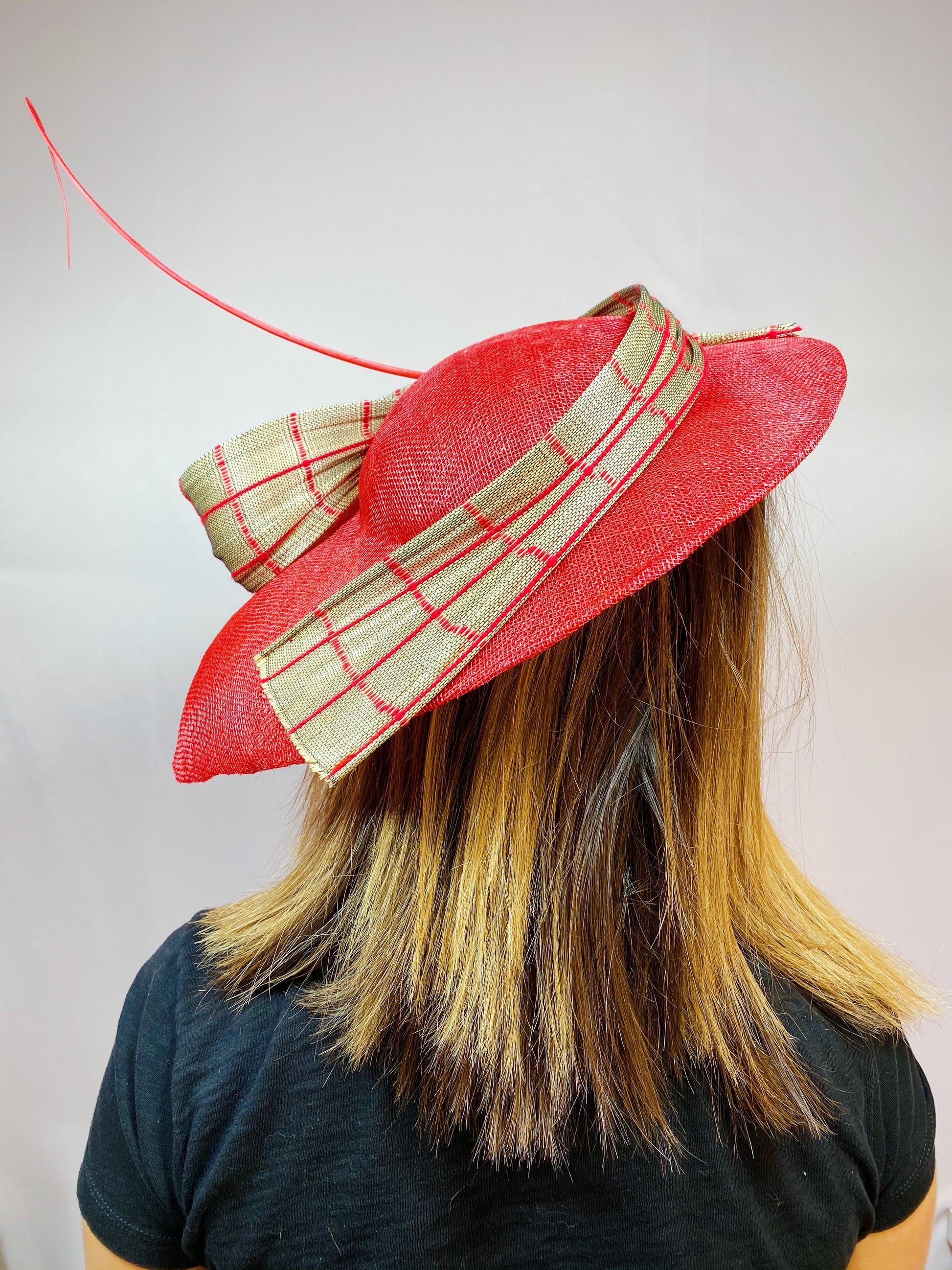 The Cheri is a beautiful pointed red saucer. Featuring red plaid jinsin and a red quill. Hand blocked using the finest materials.